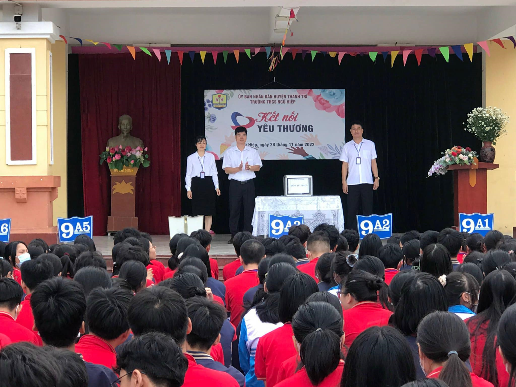 Tiếp nối truyền thống đó, ngày hôm nay, Ban giám hiệu, Công đoàn, Liên đội tổ chức tiết sinh hoạt dưới cờ “Kết nối yêu thương” để thông báo cho cán bộ, giáo viên, phụ huynh, học sinh toàn trường biết được hoàn cảnh khó khăn và nỗi đau mà em học sinh Đào Thị Bảo Yến - lớp 6A9 đang phải gánh chịu. Học sinh Đào Thị Bảo Yến lớp 6A9 mắc căn bệnh hiểm nghèo – ung thư máu. Hiện em đang điều trị tại bệnh viện Huyết học trung ương. Gia đình em ở Hưng Hà, Thái Bình và tạm trú tại thôn Việt Yên, Ngũ Hiệp. Hoàn cảnh gia đình khó khăn, bố mẹ làm công nhân tại Hưng Yên, phải tạm nghỉ để chăm sóc con gần 2 tháng nay. Hiện giờ gia đình em đang gặp khó khăn về tài chính vì tiền viện phí rất cao.