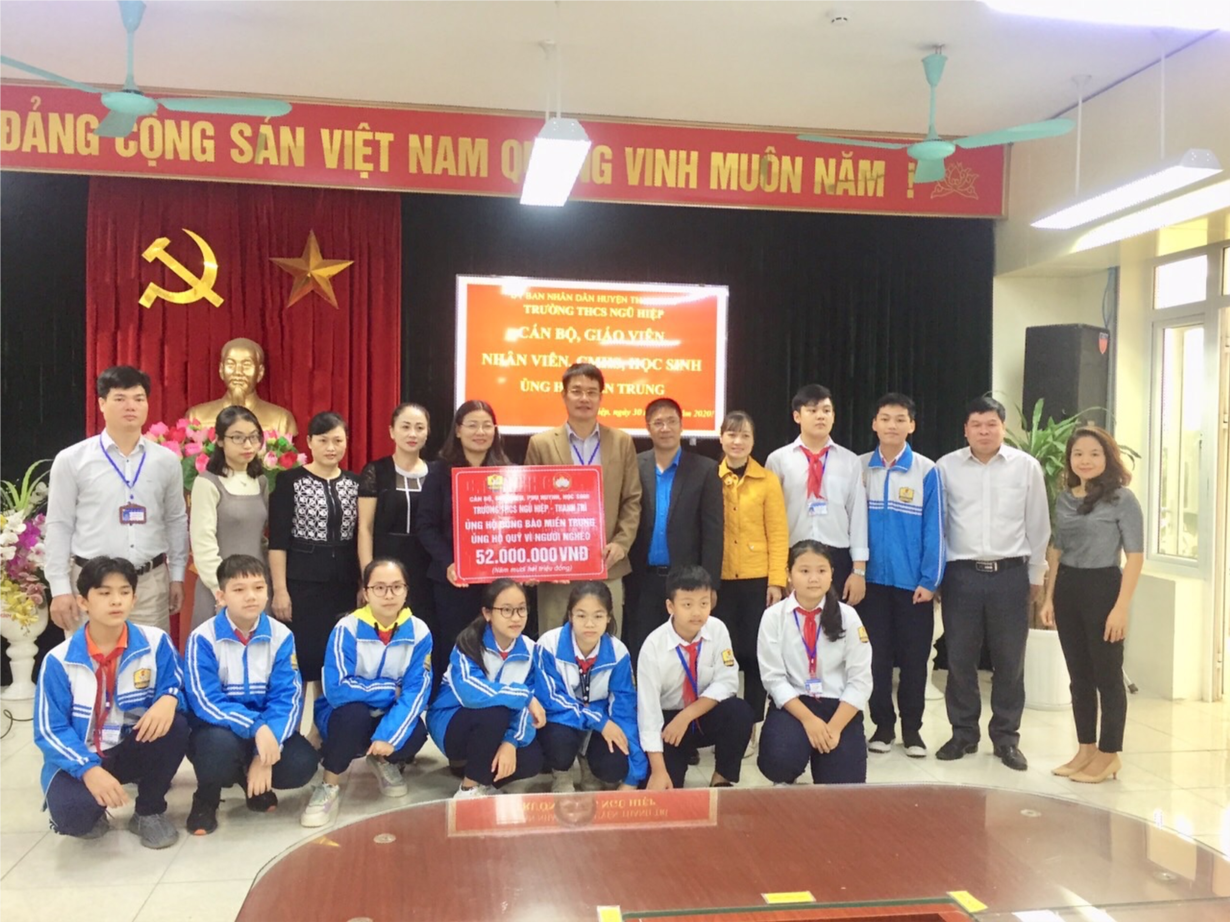 Ngày 26/10/2020, Thầy và Trò trường THCS Ngũ Hiệp đã tổ chức tiết sinh hoạt dưới cờ qua thông điệp “ Áo trắng đến trường” với mong muốn các bạn nhỏ vùng lũ sớm được trở lại trường học; được vui chơi, được học tập sau những ngày oằn mình chống bão. Ngay sau lễ phát động hưởng ứng lời kêu gọi của Ủy ban TW MTTQ Việt Nam, các thầy cô giáo trong BGH, Hội đồng sư phạm nhà trường, đại diện BCH hội CMHS và toàn thể học sinh đã dành tặng những món quà nhỏ bé nhưng ấm áp nghĩa tình đến đồng bào miền Trung.