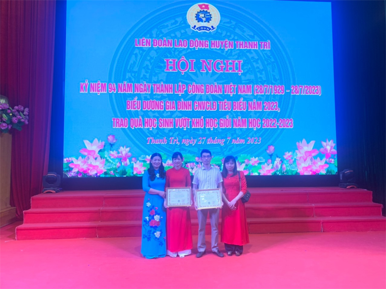 Ngày 27/7/2023, LĐLĐ huyện Thanh Trì tổ chức kỉ niệm 94 năm ngày thành lập Công đoàn Việt Nam (28/7/1929-28/7/2023) và biểu dương GĐCNVC tiêu biểu, trao quà cho HS vượt khó học giỏi năm học 2022-2023. Đây là một hoạt động thiết thực, ý nghĩa không chỉ vinh danh, khích lệ, động viên các CĐV mà còn khẳng định vai trò của gia đình CNVCLĐ ; bảo tồn, phát huy truyền thống văn hóa tốt đẹp của gia đình Việt Nam và sự đóng góp tích cực, hiệu quả của gia đình CNVCLĐ trong xây dựng, bảo vệ, phát triển đất nước.